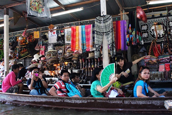 Yüzen çarşıda sandallarla gezerken alışveriş yapabiliyorsunuz. Tropikal meyveleri her köşeden almak mümkün.